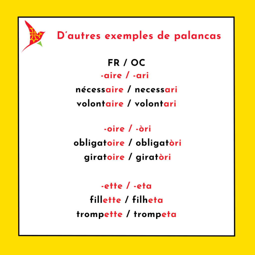 Quand se compara d’unes mots entre las doas lengas, se remarca una transformacion subtila, mas que fa tota la diferéncia !